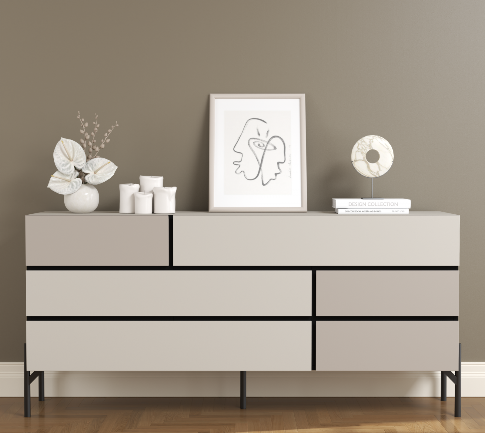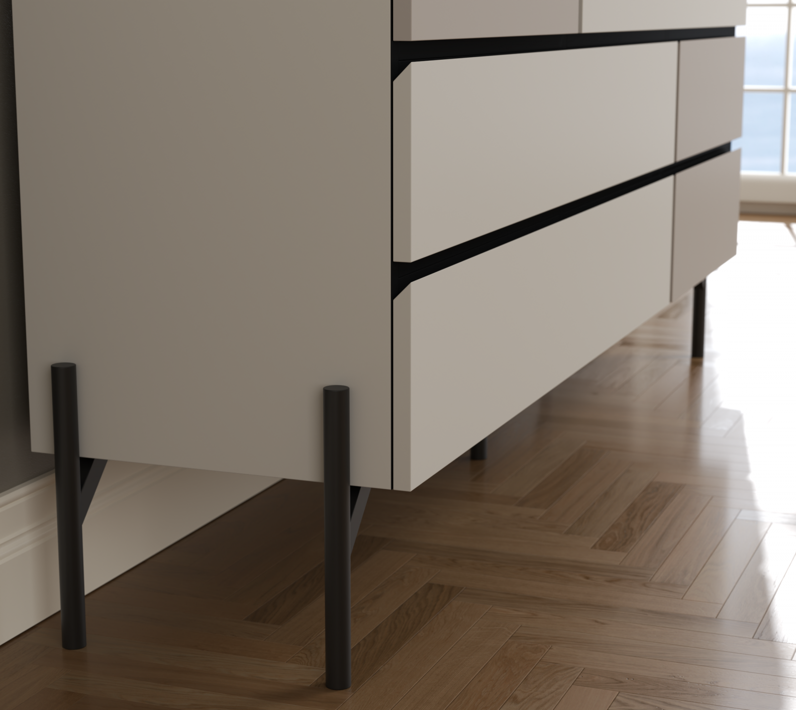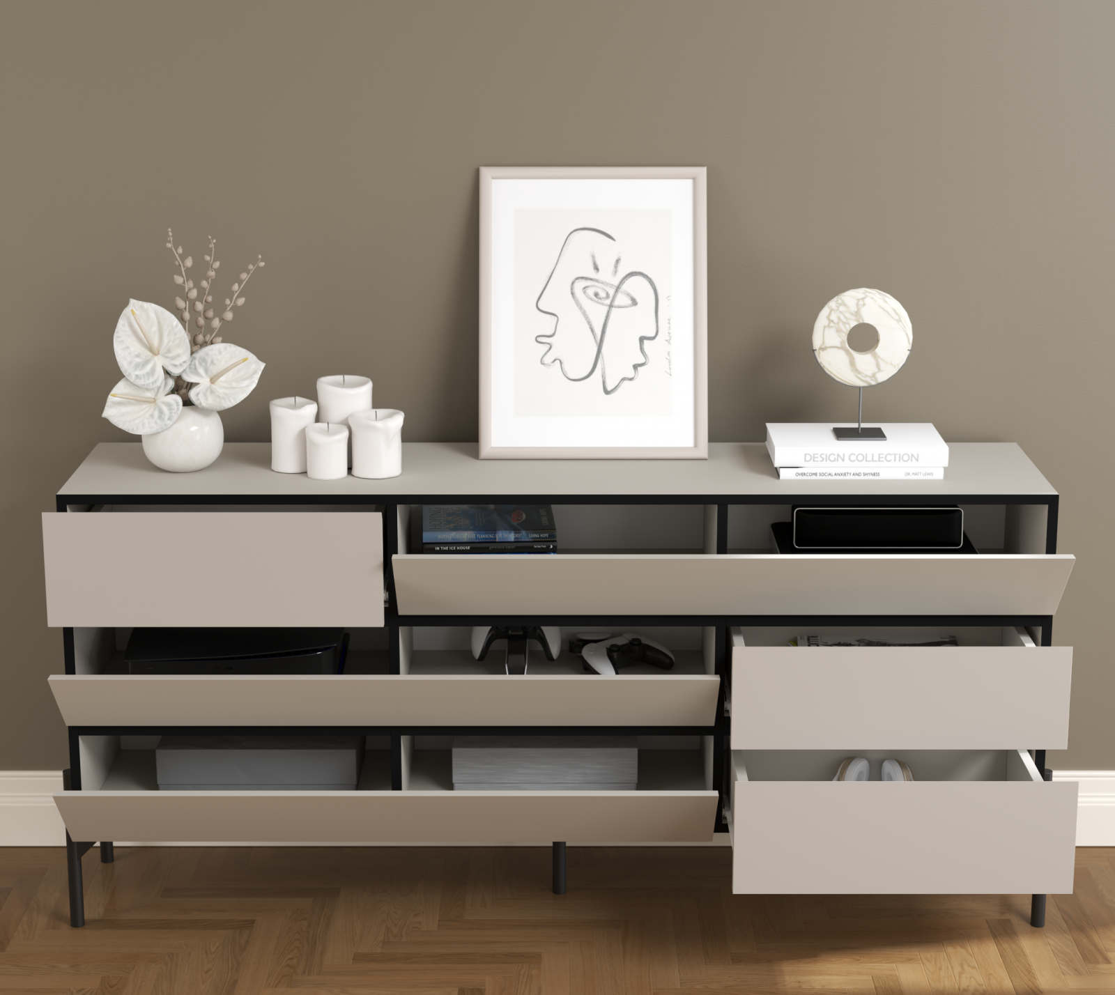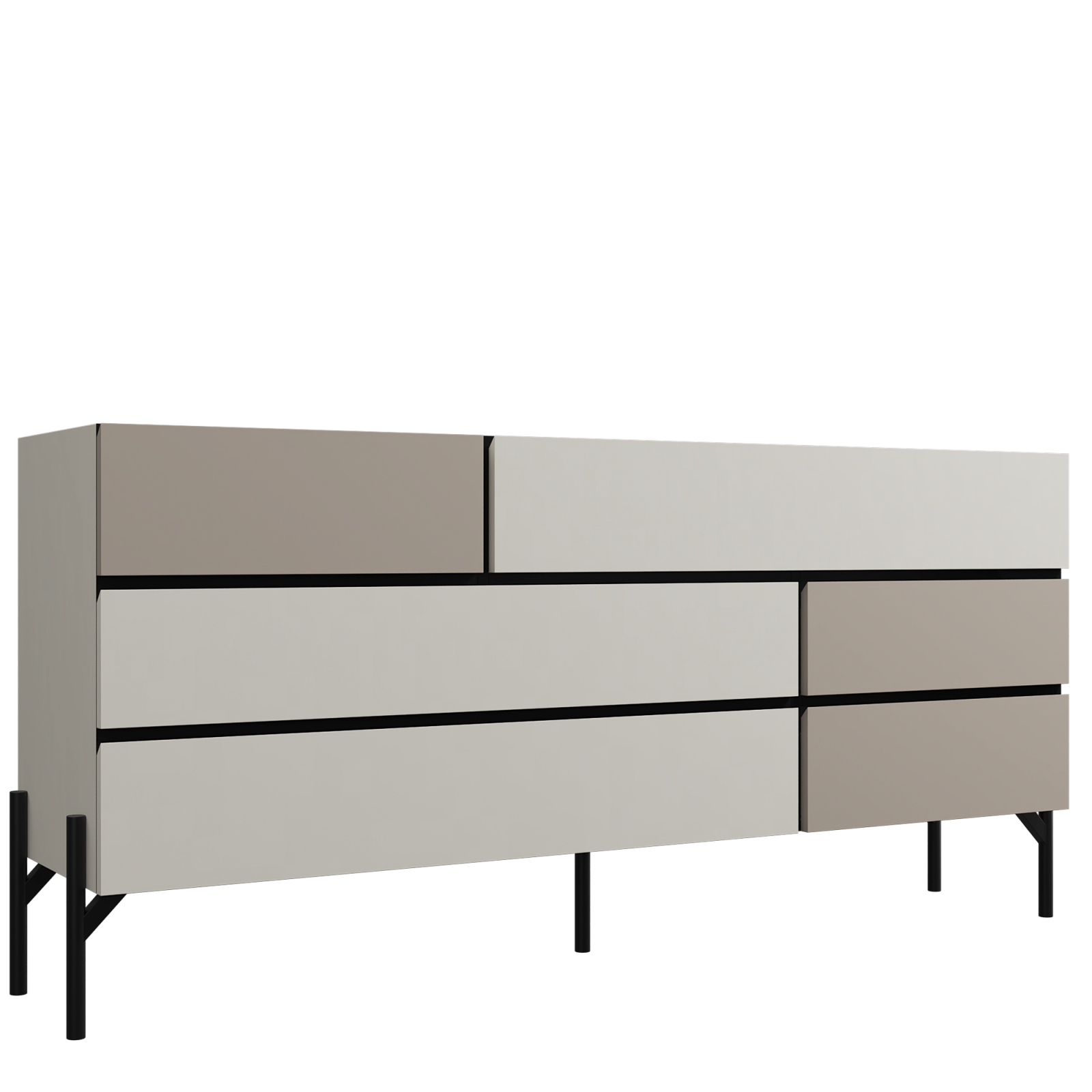 Consolă Modernă cu 3 Sertare și 3 Uși – Design Minimalist, Culoare Sandstone / Costa – PAL Melaminat + Picioare Metalice