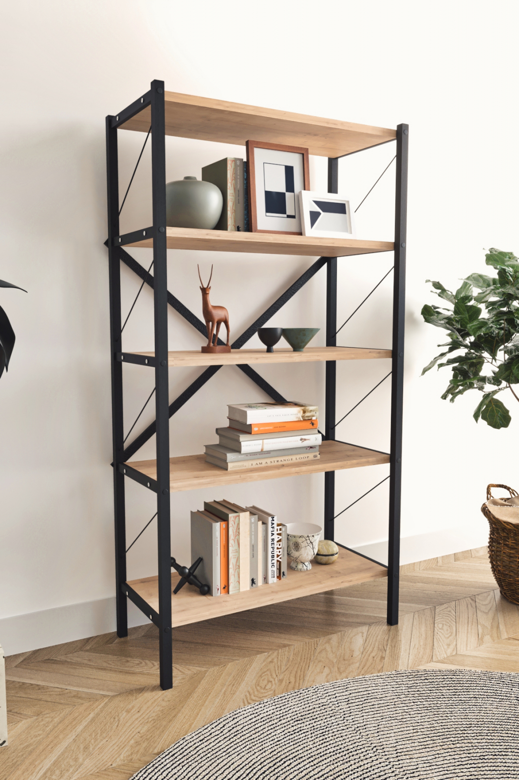 Depozitare generoasă – cele 5 rafturi încăpătoare susțin atât cărți, cât și obiecte decorative de diverse dimensiuni.