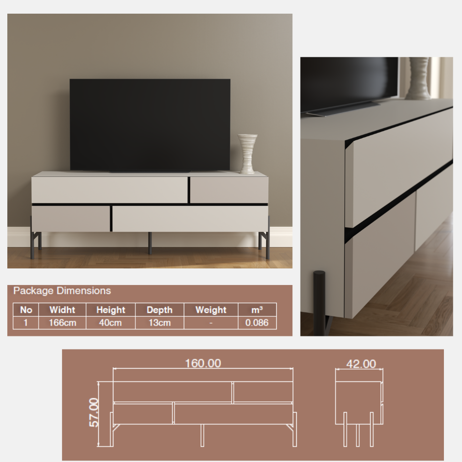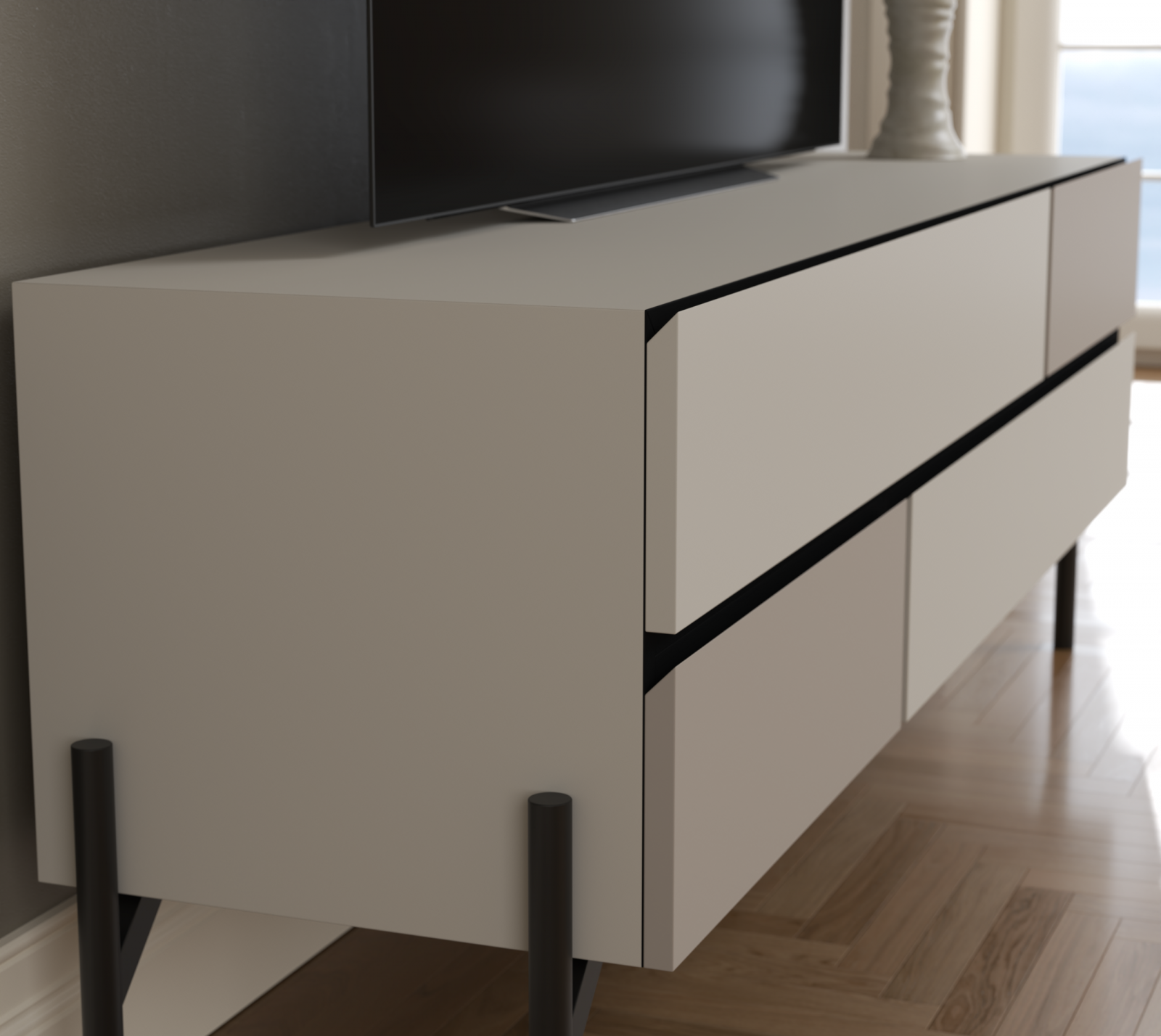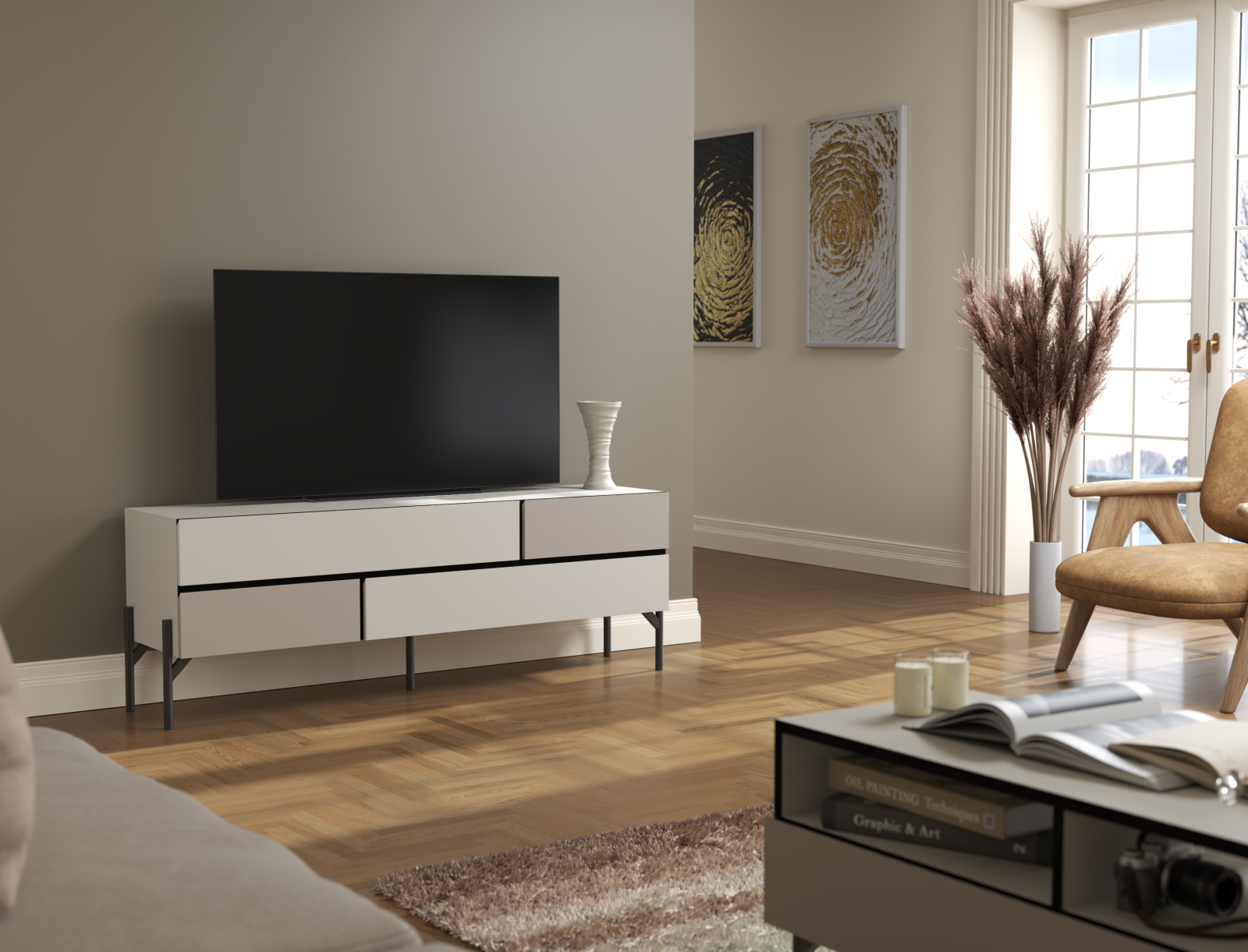 Această comodă TV oferă un spațiu generos pentru depozitare, menținând un aspect ordonat și modern în livingul tău. Cu 2 sertare și 2 uși, este gândită atât pentru echipamente multimedia, cât și pentru organizarea discretă a obiectelor personale.