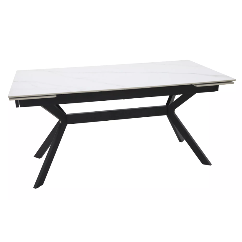 Blatul mesei este realizat din ceramică rezistentă, un material premium ușor de întreținut și perfect pentru utilizarea zilnică, care își păstrează frumusețea chiar și după ani de utilizare intensă. Cadrul robust din metal solid oferă stabilitate excelentă și un contrast vizual puternic cu finisajul alb‑negru, pentru un look modern care completează perfect orice decor de interior.