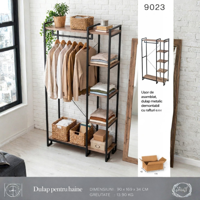 Cuierul pentru haine cu rafturi este o soluție practică și modernă pentru organizarea eficientă a hainelor, încălțămintei și accesoriilor în locuință. Cu un design contemporan care combină structura metalică rezistentă cu rafturi elegante din lemn, acest cuier oferă atât funcționalitate, cât și un aspect decorativ plăcut în orice cameră. Este ideal pentru dormitor, hol, dressing sau chiar pentru spații comerciale, oferind un mod organizat și accesibil de a păstra hainele la îndemână. Dimensiunile sale generoase, cu 169 cm înălțime, 90 cm lățime și 34 cm adâncime, permit depozitarea eficientă fără a ocupa prea mult spațiu în cameră.