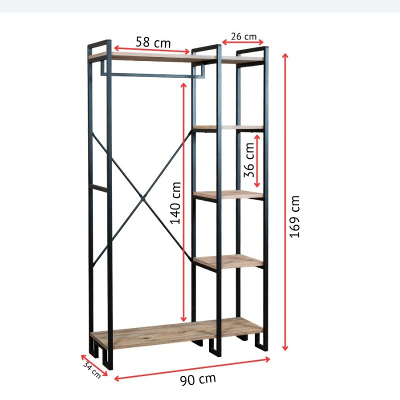 Cuier de haine - Aris - cu rafturi și suport pentru umerașe, structură metalică și rafturi din lemn, dimensiuni 169x90x34 cm