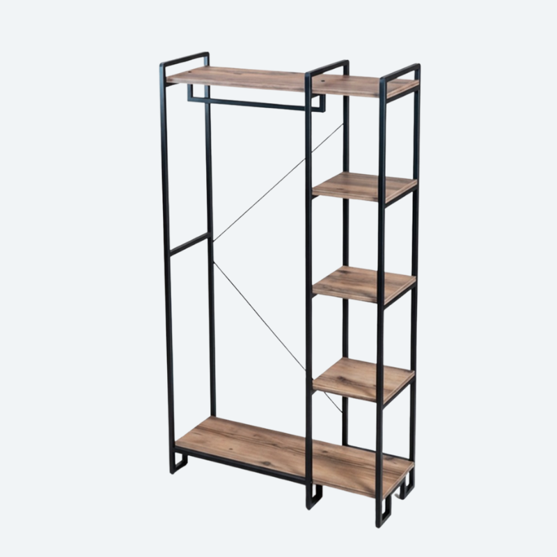 Construcția robustă din metal rezistent și rafturi solide din lemn oferă stabilitate și durabilitate în timp. Materialele sunt concepute pentru utilizare zilnică și pentru a susține greutatea hainelor și accesoriilor fără probleme. Designul minimalist se potrivește perfect în interioare moderne, industriale sau scandinave, fiind o piesă de mobilier versatilă care se integrează ușor în diferite stiluri de amenajare.