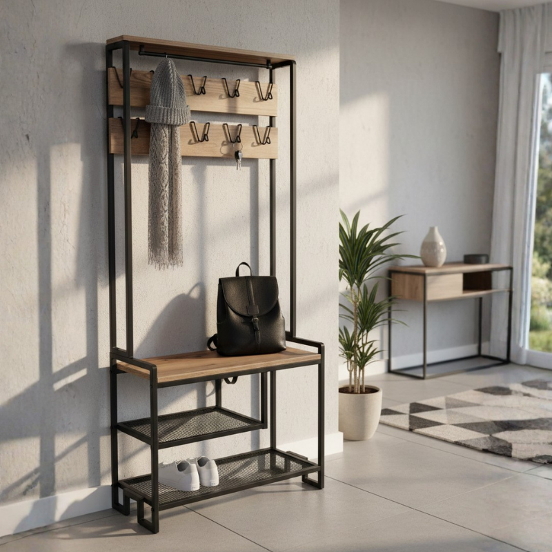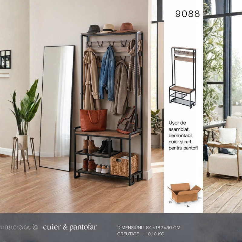 Construcția solidă din metal rezistent și rafturi durabile asigură stabilitate și utilizare pe termen lung. Designul minimalist cu accente industriale îl face ușor de integrat în diferite stiluri de amenajare interioară, de la modern la loft sau scandinav. Acest cuier cu pantofar este alegerea perfectă pentru persoanele care doresc un spațiu de intrare organizat, elegant și funcțional, oferind în același timp un loc dedicat pentru haine, încălțăminte și accesorii.