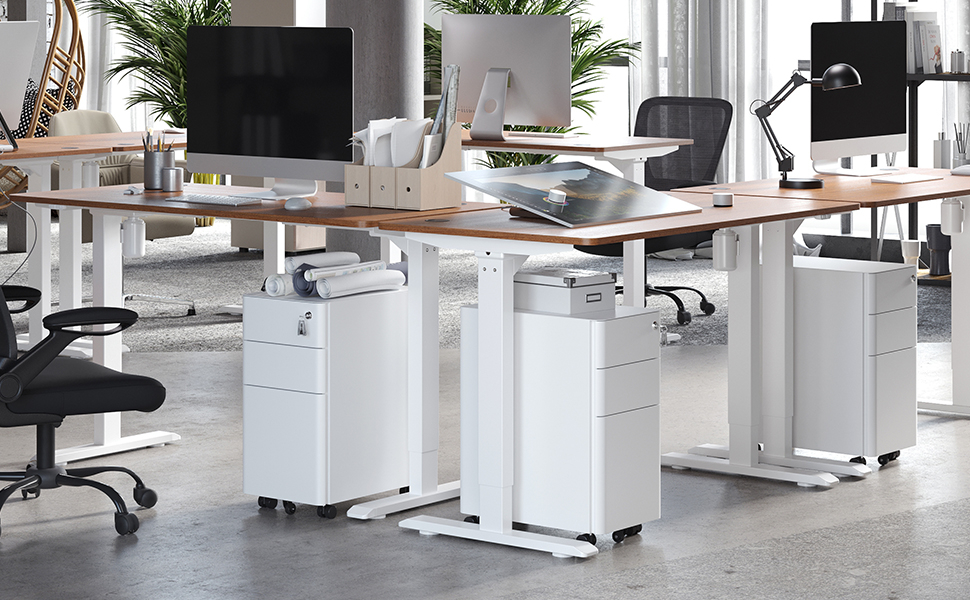 Mobilitatea este un punct forte al acestui produs: casetiera este echipată cu 5 roți care permit deplasarea ușoară în jurul biroului, iar 2 dintre roți au frâne integrate pentru a fixa unitatea exact unde dorești. Designul fără mânere, dar ușor de utilizat, permite tragerea sertarelor fără efort, iar colțurile rotunjite protejează împotriva loviturilor accidentale